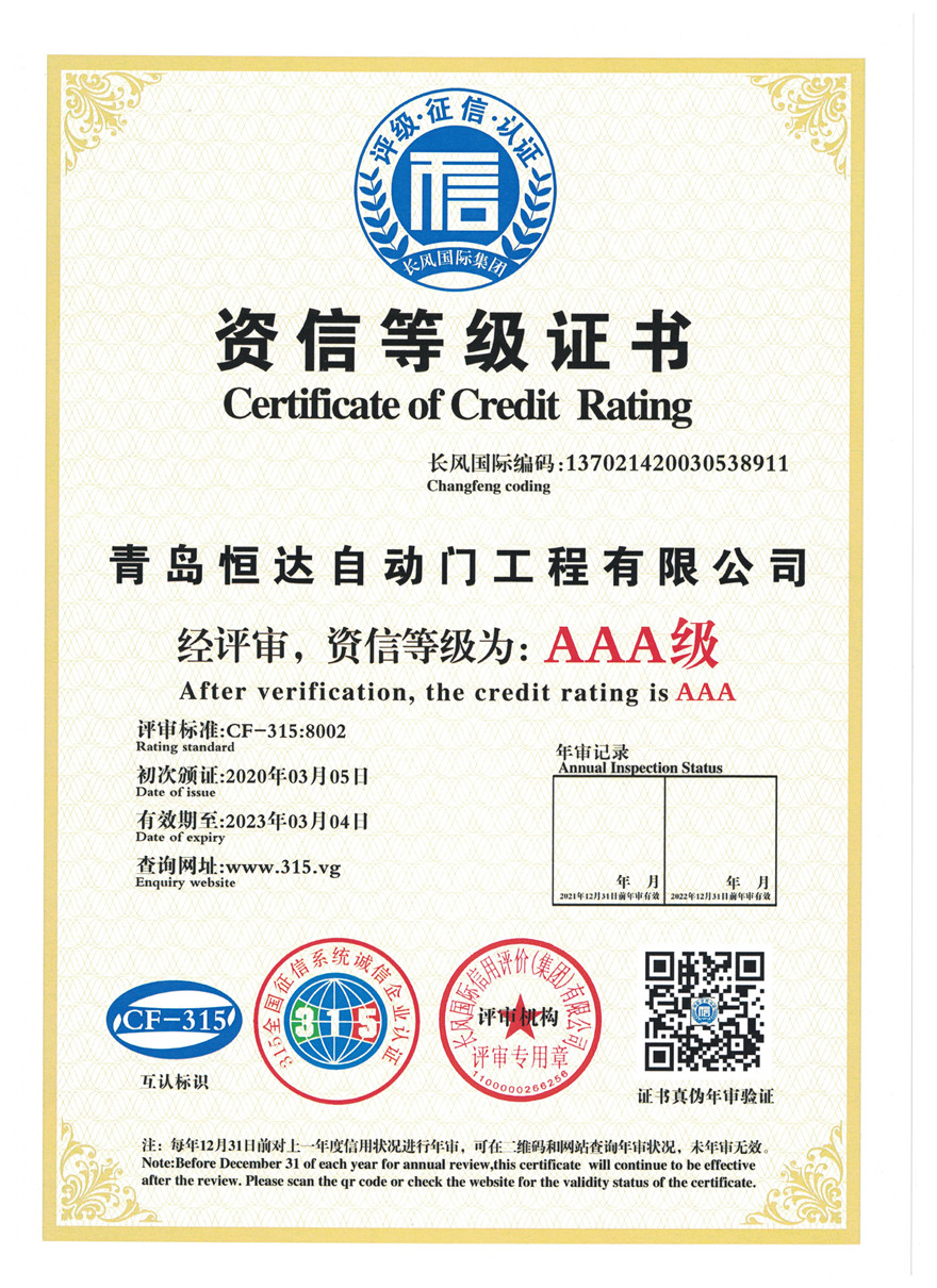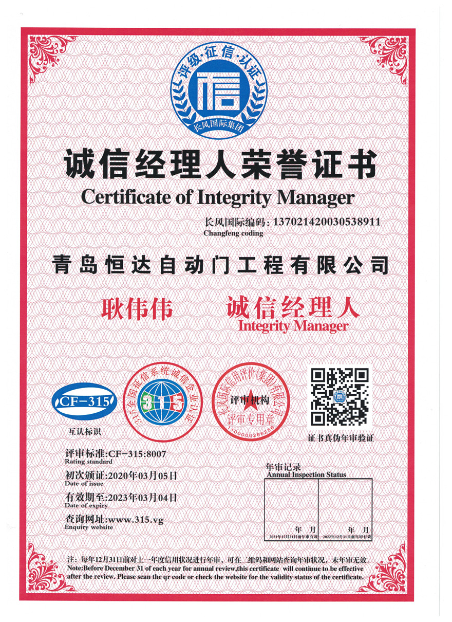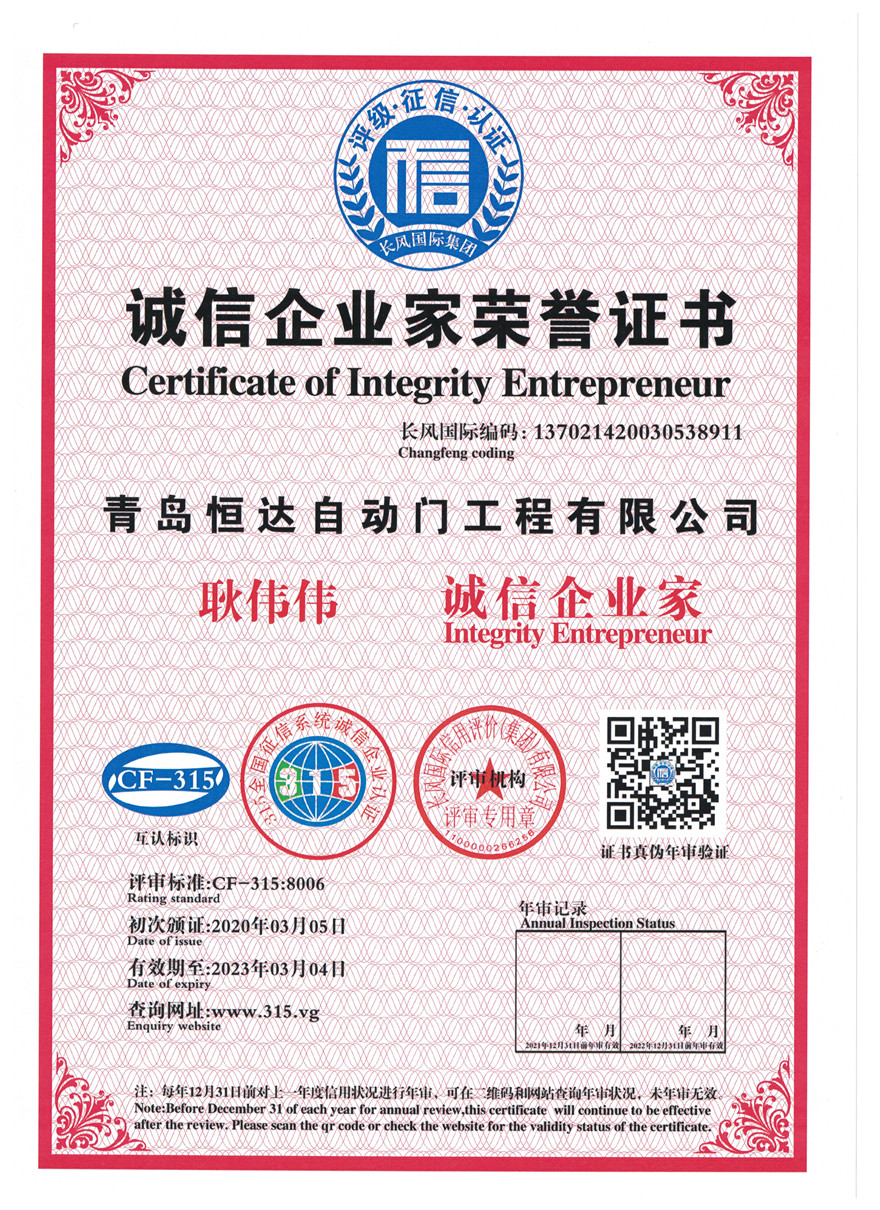 • 青岛恒达自主研发的旋转门资质专利