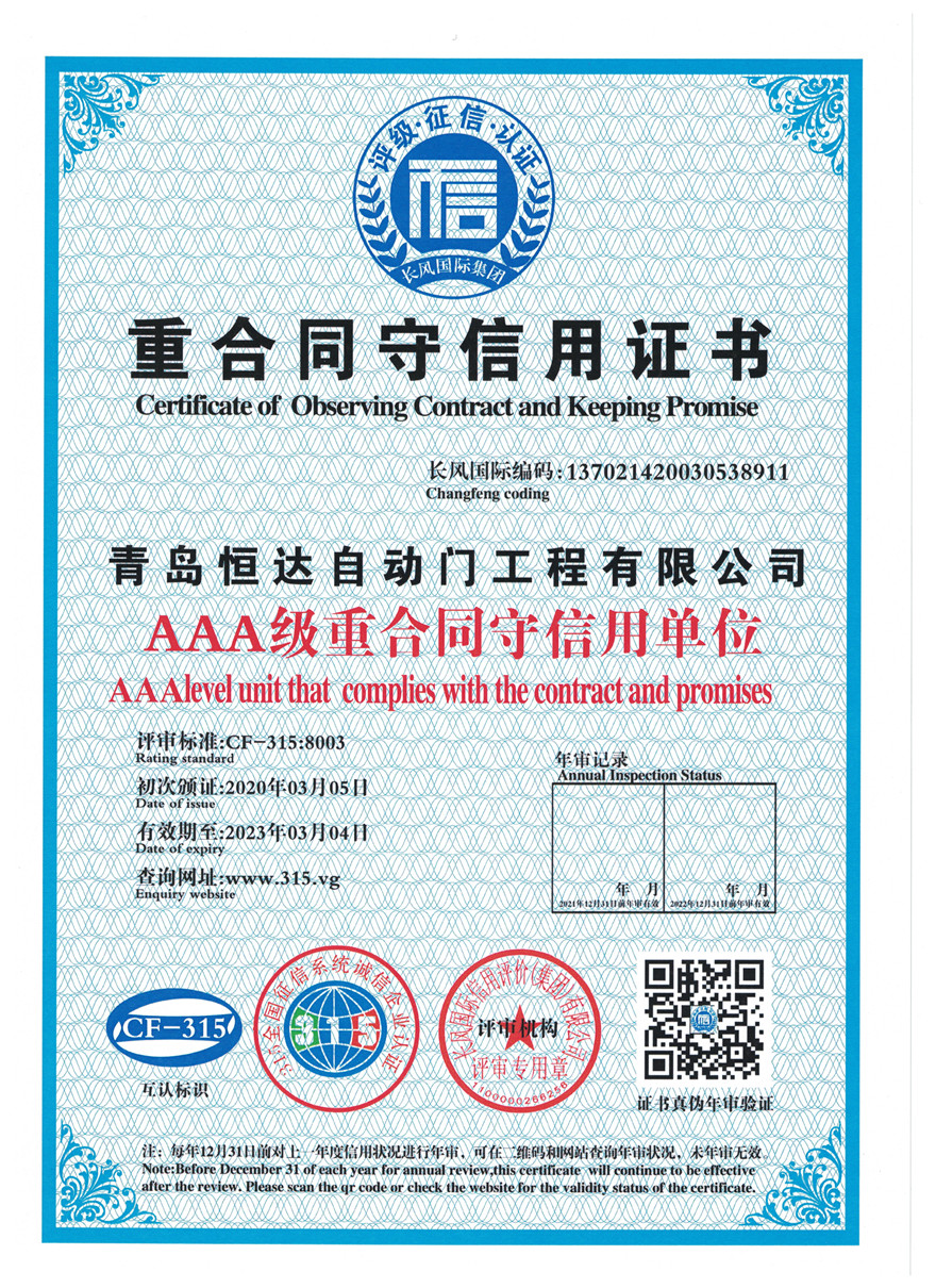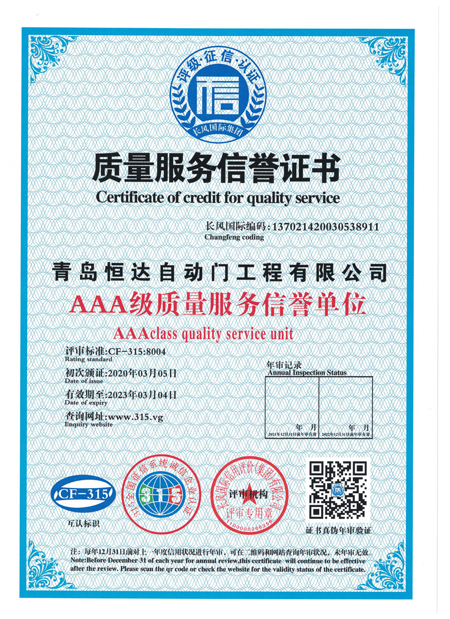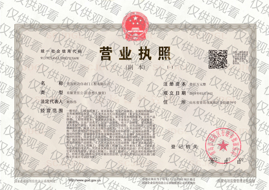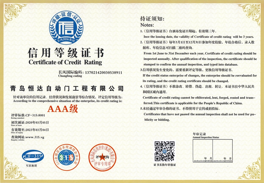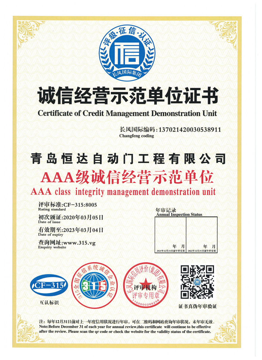 • 青岛恒达自主研发的旋转门资质专利