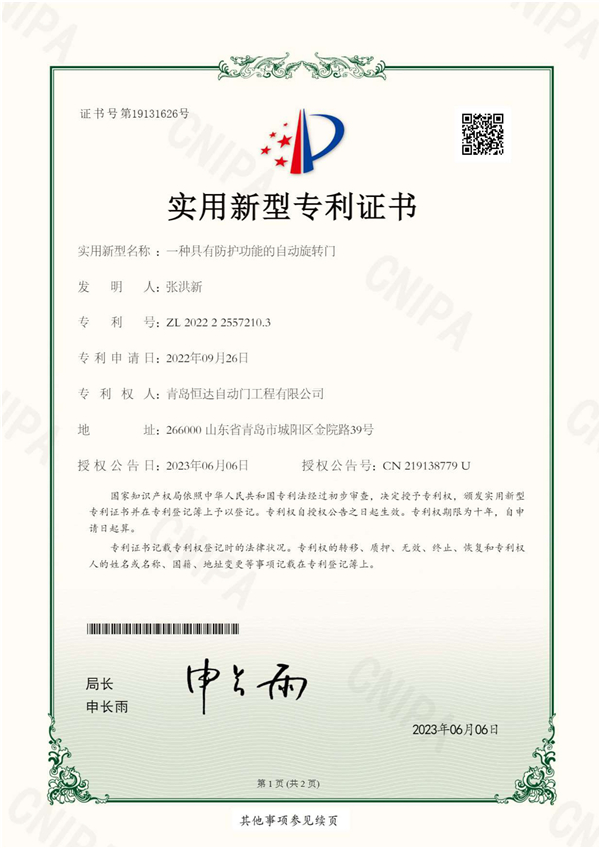青岛恒达自主研发的旋转门资质专利