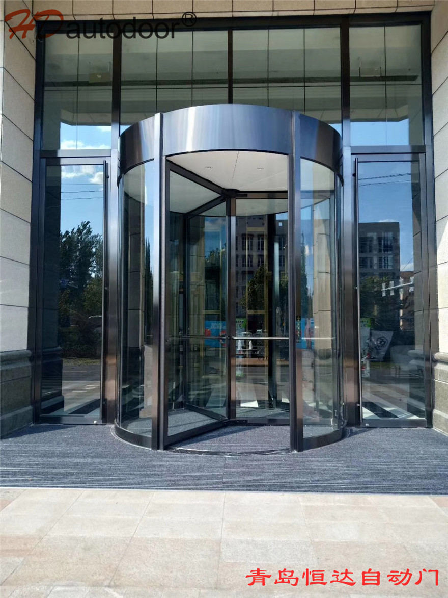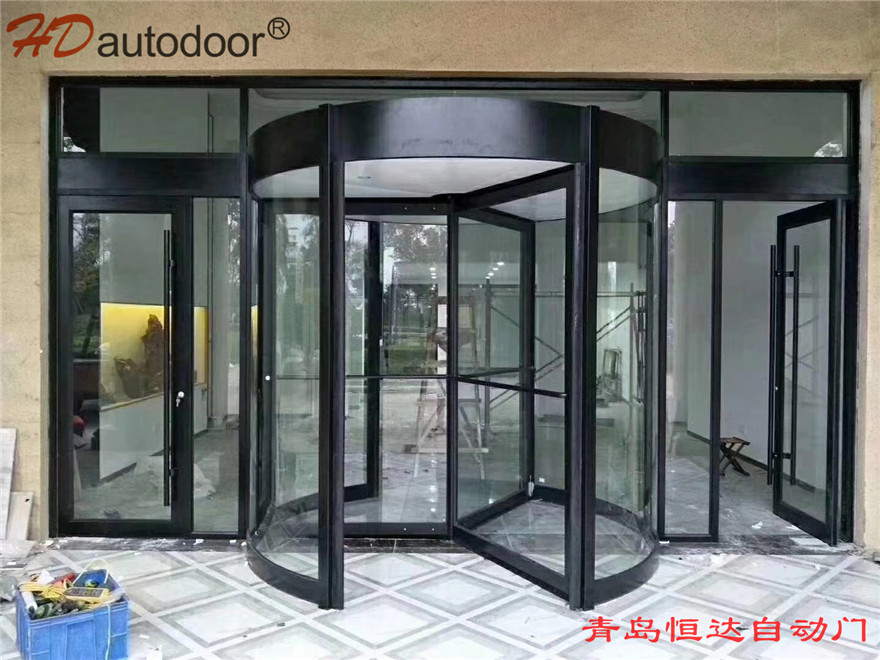 三翼手动旋转门 Three-wing revolving door 产品特点 机械构造,低故障率。造型简洁、包饰美观、结构合理等的特点,被广泛应用于多种场合。同时还能满足建筑物进出口的高度、通过性及环境隔离的要求。 三翼旋转门由三大部件组成,即:固定框架、中心轴组件和旋转组件。下面将详细介绍各个组件。 (1) 固定框架。固定框架由上支撑组件及立柱、上、下码头和固定吊板组成。上支撑组件又由帽头、多个梁架、多个支撑板和托架用螺钉、螺母链接而成。立柱和上、下码头时固定框架的基础。曲壁玻璃也安装在上、下码头和立柱之间。吊顶板安装在固定框架上。 (2) 旋转组件。旋转组件由闭门器、展箱、旋转吊顶和门组件组成。旋转组件用于门的开启和关闭。 (3) 中心轴组件。中心轴组件是自动旋转门的驱动系统,是在电控系统控制下启动和关闭自动门的驱动机构。它由减速电机和驱动机构组成。