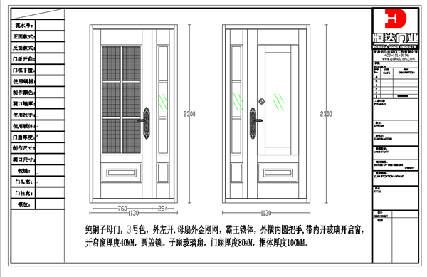 门型介绍:纯铜小子母门+金刚网纱窗+开启扇铜门
